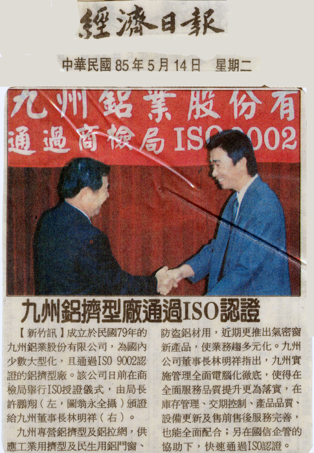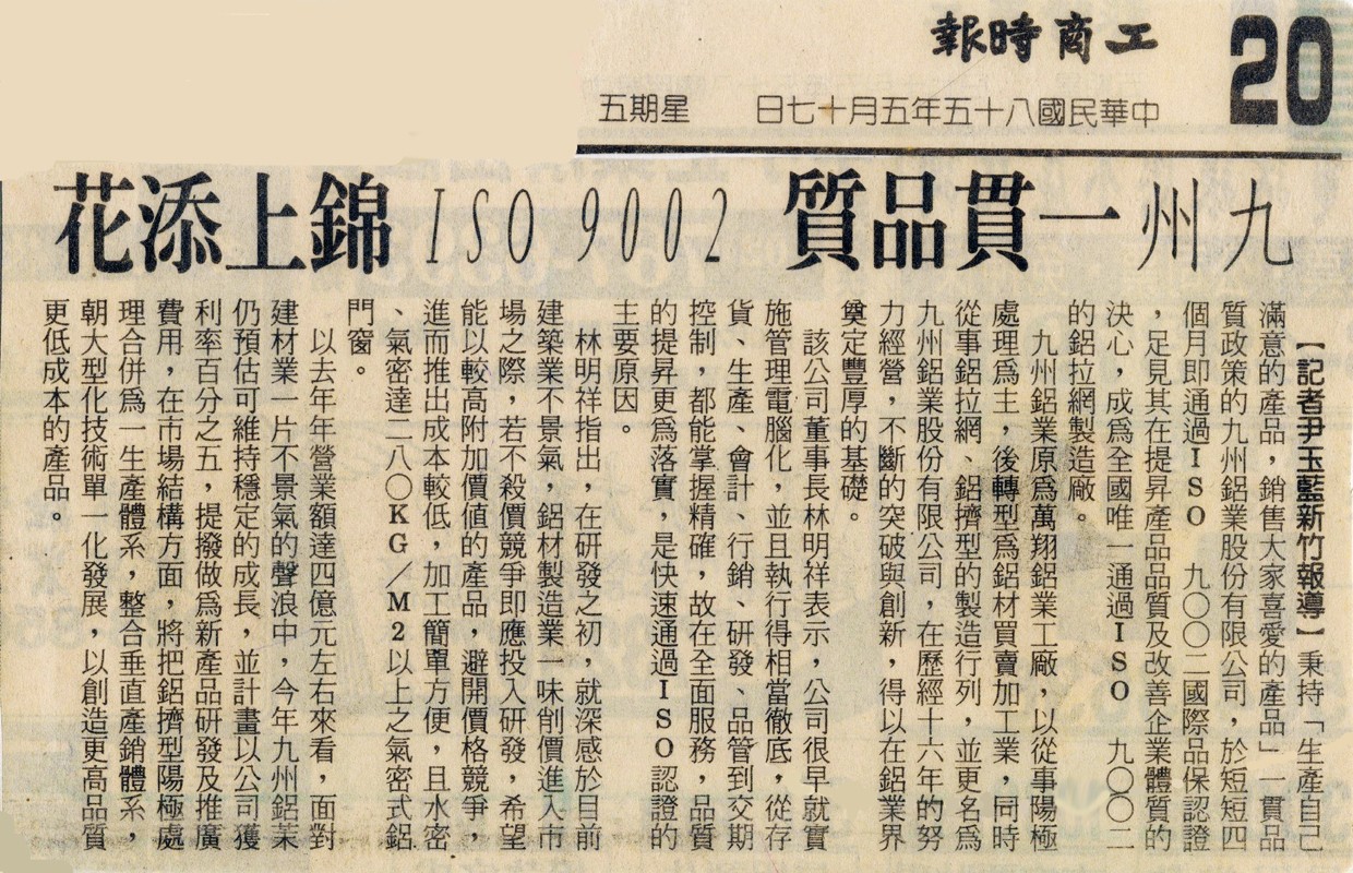『九州鋁擠型廠通過ISO認證』 報導內容 轉載:中華民國85年5月14日經濟日報