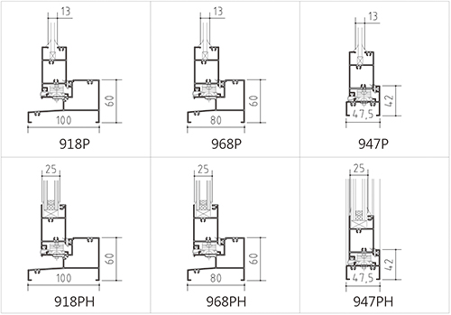 【1】947系列外框4.7公分,適用於一般固定 隔間或簡單帷幕牆使用。 【2】968系列外框8公分,可獨立安裝或搭配 所有8公分固定或橫拉窗共同使用。 【3】918系列外框10公分可獨立安裝或搭配 所有10公分固定外框; 或橫拉門共同使 用。 |